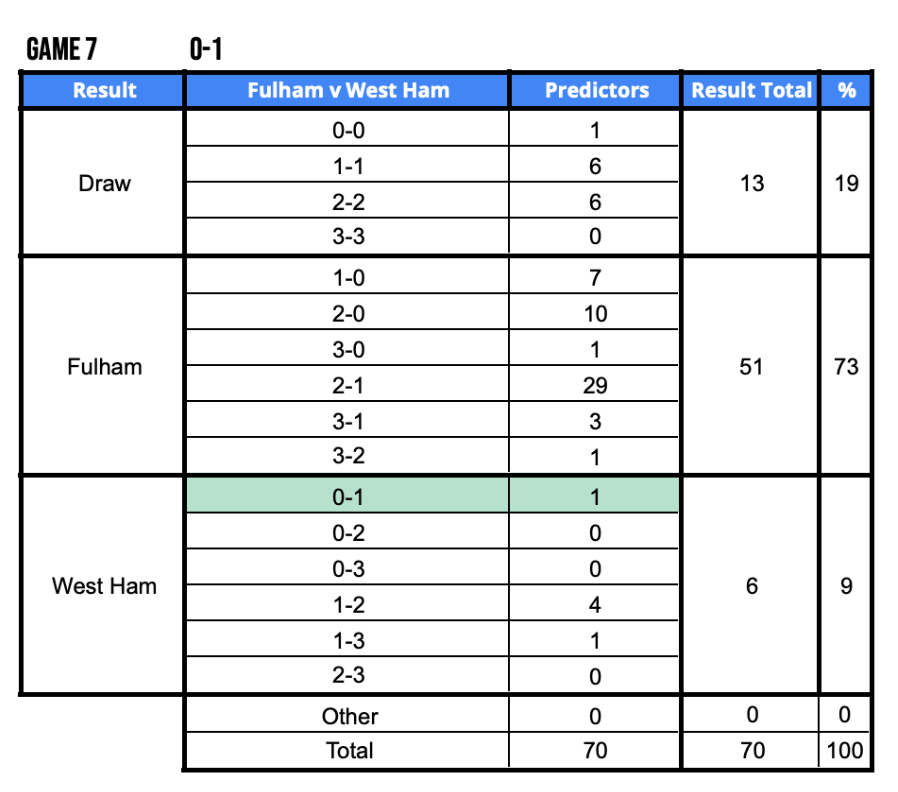 - Josh Beeston – Fulham v West Ham (0-1) – Just 90 points scored from this fixture but Josh was the only predictor to score maximum points. A game which keeps West Ham in the survival race.