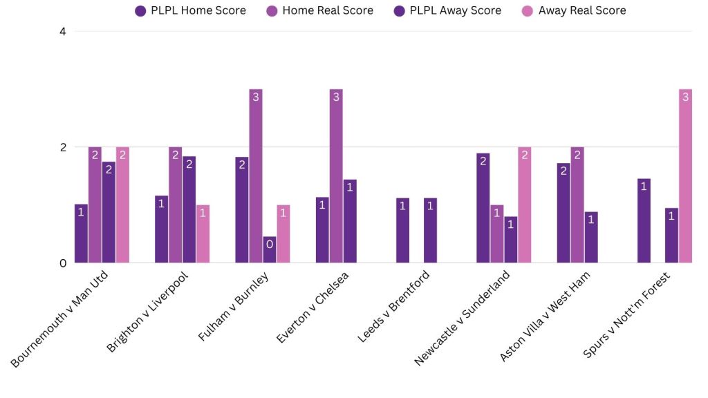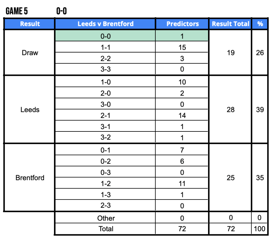 - Chris Sanderson– Leeds v Brentford (0-0) . Chris was the only predictor to land on a 0-0 draw at Elland Road, going against the grain in a fixture where both sides had been averaging over a goal per game in recent weeks. With Leeds typically strong at home and Brentford carrying a consistent attacking threat, the underlying data pointed towards goals making Sanderson’s call to back a low-event, defensively disciplined stalemate a particularly astute and differentiated prediction.