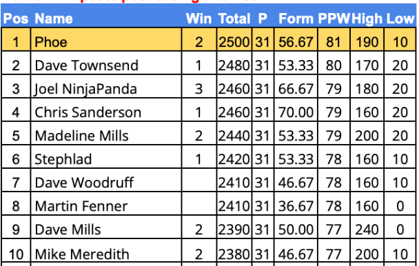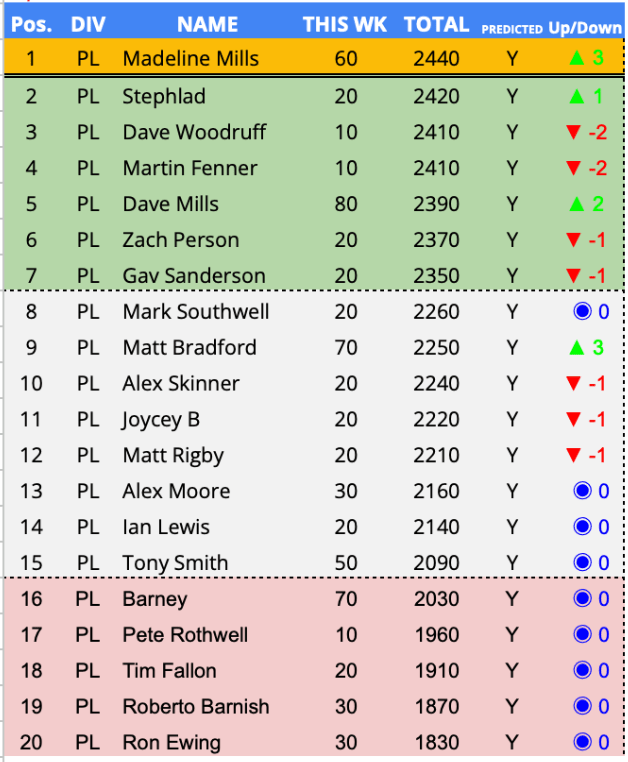 - Weekly Average PLPL Score – 33 Points (lowest of the season but the shortest game week)