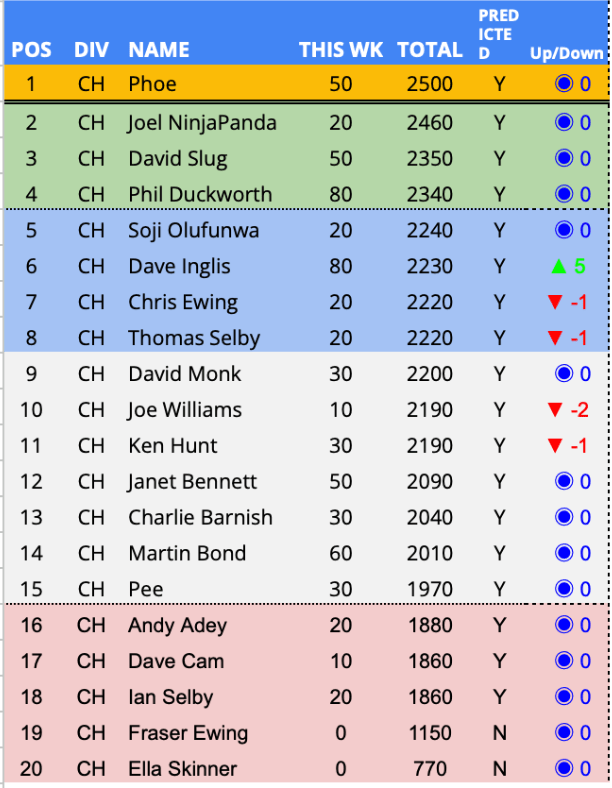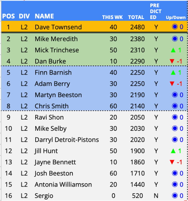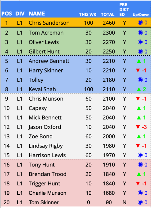 Predictor(s) of the week with 100 points / 67 points above the average. Chris Sanderson continues to set the pace in League One, picking up his first Predictor of the Week award of the season to cement his position at the top, while also holding an impressive 4th place overall in the PLPL table.