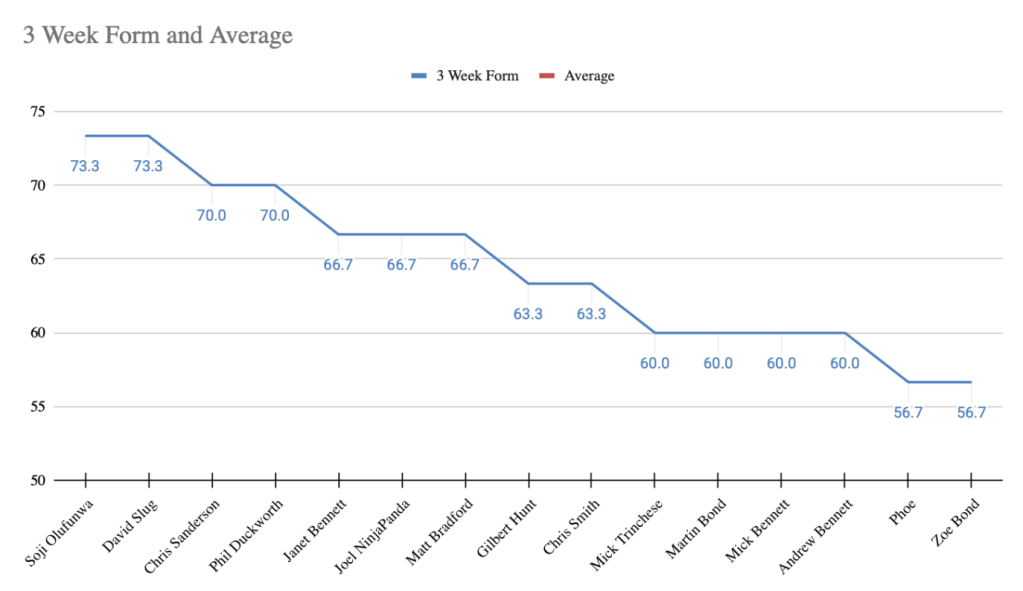 - In Form Predictor (3 Week Average) – New – 1st Week – Soji Olufunwa – 73.3 Points
