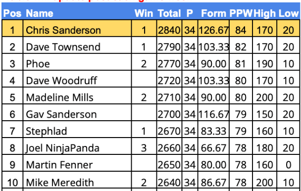 - PPW – Average points per week over the season