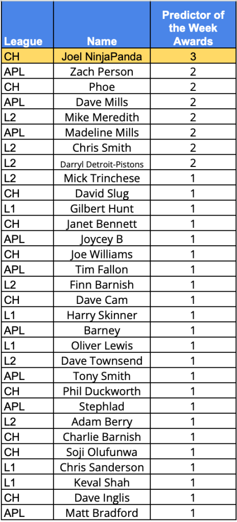- Win – No of predictor of the week awards