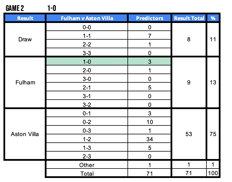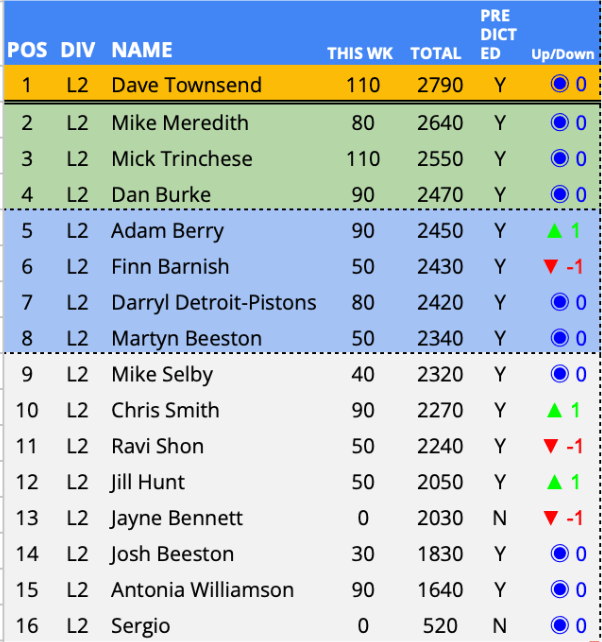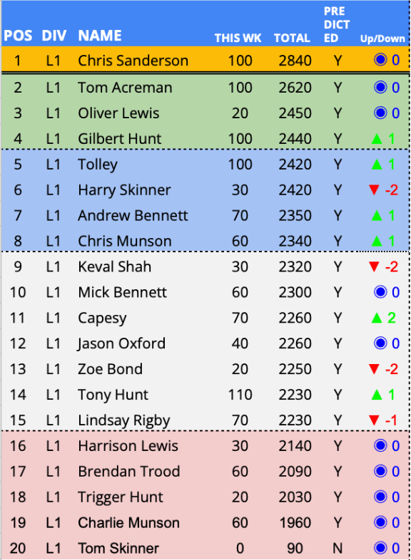 Predictor(s) of the week with 130 points / 65 points above the average. Matt takes Predictor(s) of the Week with a strong 130-point return, finishing the round in style with 40 points from the final three fixtures, Wolves v Spurs, Arsenal v Newcastle and Man Utd v Brentford, a decisive late surge in the game week.